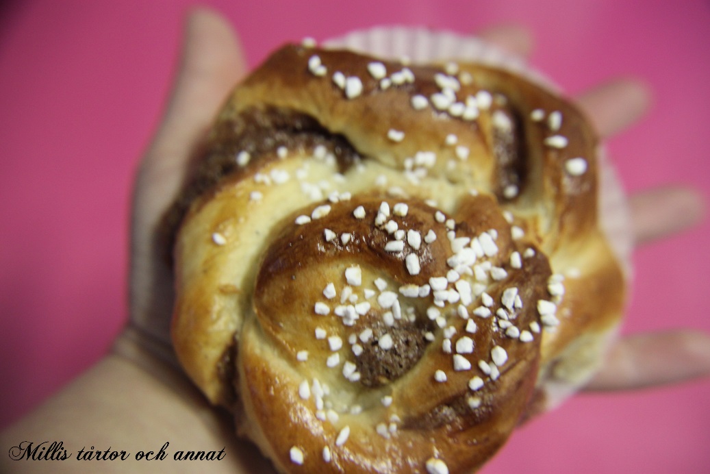 Fyllning: smält smöret och låt svalna lite. Rör i övriga ingredienser och rör tills en jämn smet. Kavla ut degen, bred fyllningen på. Lägg dubbel, skär remsor, snurra motsatt håll så det blir "snurrbullar" låt jäsa 20 min. Pensla på ägg och strö över pärlsocker. Grädda 225° ca 12-14 min.