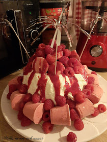 På nyårsafton var vi 20 personer inklusive 8 barn som träffades och åt supergod tre rätters, och jag fick äran att stå för efterrätten. Vet att många i detta gänget är kräsna så jag kom ganska snabbt att tänka på denna desserten som jag hade ätit på en Nobelmiddag med LC för några veckor sen, den har serverats på riktiga Nobelmiddagen för några år sen och receptet fanns med i Nobelboken. Det är en mäktig å avancerad glassbomb med väldigt många olika moment som att koka sockerlag till 123 grader och sen vispa till en viss temperatur och sen har jag även vispat marängsmet till 63 grader som även den skulle vispas tills den blivit rumstempererad och kokat egen hallonpuree osv. Tog sammanlagt 6 timmar att göra men det var det värt med tanke på allt beröm den fick :)